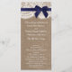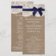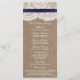 A design apresenta um adorável fundo de efeito de burlap rustico com uma trim romântica de efeito de renda branca vintage terminada com uma fita marinho impressionante com arco. Esses programas podem ser personalizados para sua ocasião especial e fariam a modelo perfeita para casamentos, chás de panela, festas de noivado, festas de aniversário e muito, muito mais. *Observe que o Zazzle só vende produtos impressos para que esses programas não tenham nenhum material real de burlap, renda, arco ou fita.