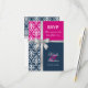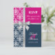 © Socialite Designs. Elegante cartão de resposta para convite de casamento de verão incorporando damasco branco, fita e laço prata impressos e duas cores de fundo, azul-marinho e fúcsia. Entre em contato com a Socialite Designs se desejar uma combinação de cores diferente, ajuda para personalizar ou outros produtos de casamento criados com este design. POR FAVOR, OBSERVE QUE A FITA É UMA IMAGEM E É IMPRESSA NO CONVITE.