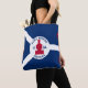 Saco com bandeira da cidade de Fort Wayne, Indiana; bandeira azul e branca e com um bloco vermelho no centro e três ilustrações no campo azul - ilustração da cabeça do Nativo Americano, da fleur-de-lys Francesa e do leão Britânico