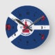 Relógio com bandeira da cidade de Fort Wayne, Indiana; bandeira azul e branca e com um bloco vermelho no centro e três ilustrações no campo azul - ilustração da cabeça do Nativo Americano, da fleur-de-lys Francesa e do leão Britânico