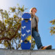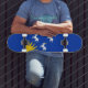Skateboard with design with a flag of historic county of Merioneth, in Wales, Great Britain; blue azure flag with three white goats and yellow sun