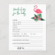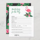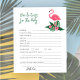 O design de convite para chá de fraldas apresenta flamingo cor-de-rosa com frondes verdes de palma e flores de hibisco tropicais. "Aloha Baby". Um padrão floral tropical com cor preta de fundo se veste na parte de trás do cartão.