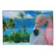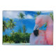 Pássaros surpreendentes dos animais selvagens, flamingos. Flamingo cor-de-rosa, mar, palmas e praia tropical.