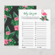 O design de convite para chá de fraldas apresenta flamingo cor-de-rosa com frondes verdes de palma e flores de hibisco tropicais. "Aloha Baby". Um padrão floral tropical com cor preta de fundo se veste na parte de trás do cartão.