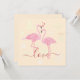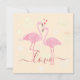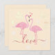 Flamingos apaixonados por corações e a palavra "amor" em tipografia de guião sobre elementos tropicais. Na parte de trás do cartão "Eu te amo mais a cada dia".