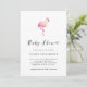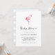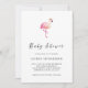 Este convite elegante e moderno do chá de fraldas apresenta um flamingo cor-de-água cor-de-rosa e um design minimalista, com uma cinza neutra listrada para trás.