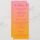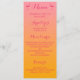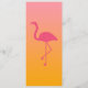 Cartão de menu de recepção de casamento tropical com duas pequenas silhuetas de flamingo rosa. A cor de fundo é cor-de-rosa a laranja. Do outro lado do cartão há também uma silhueta flamingo maior, de cor rosa. Personalize o texto com os detalhes do seu evento.