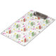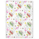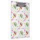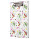 Uma prancheta que caracteriza um teste padrão temático retro com ilustrações de flamingos cor-de-rosa, de flores, de estamenha, de abelhas, e de campistas retros.