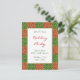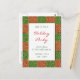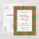 Um modelo de convite de cartão postal de festas de feriado personalizado com letras de script e um padrão de fundo de azulejos elegantes de fleur de lis de um lado e quarto para as suas informações de festas personalizadas e o endereço de retorno no verso.