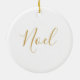 Este Enfeites de natal cerâmico é mostrado aqui com um impressão de festas de neve de ouro festivo. A parte de trás diz Noel em ouro. Personalize este item ou comprar como está. Imagem do stock