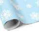 Este papel de embrulho azul claro é decorado com um padrão de flocos de neve delicados e detalhados para criar um plástico de presente bonito para todos os seus presentes de inverno.