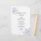 Personalize o festivo Blue Snowflakes no Menu White Casamento no inverno com os detalhes da refeição que servirá no almoço de chá de panela de dezembro, Janeiro ou fevereiro, ensaie a janta ou a recepção de casamentos adicionando a salada ou o primeiro curso, a entrada ou o segundo curso e a sobremesa ou o terceiro curso. Personalize-o com os nomes da noiva e do noivo, localização do local e data do evento. Este elegante e personalizado cardápio de casamento da Maravilha de inverno apresenta intrincados flocos de neve azuis adorando os cantos com um fundo branco.