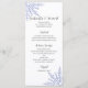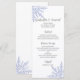 Os festivos Flocos de Neve Azul no Menu Casamento no inverno Branco podem ser personalizados com os detalhes da refeição que você servirá no almoço de chá de panela de dezembro, janeiro ou fevereiro, janto de recepção de casamentos ou poste do brunch de casamento adicionando a salada ou o primeiro curso, a entrada ou o segundo curso e a sobremesa ou o terceiro curso. Personalize-o com os nomes da noiva e do noivo, localização do local e data do evento. Este elegante cardápio de casamento da Maravilha de inverno mostra flocos de neve incrivelmente coloridos enfeitando os cantos com fundo branco.