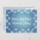 Flocos de neve brancos e azuis em um fundo azul de estrelas cintilantes e neve Cardo de casamento Salve a data. Há itens correspondentes, como postagem, adesivo, etiqueta, ímã. Basta verificar minha loja.
