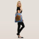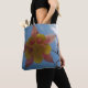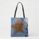 Sobre a bolsa de tota do ombro com fotografia de uma flor columbina contra um céu azul brilhante. Fotografia original de Ray Bean.