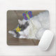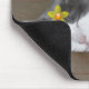 A fotografia de um gato de racum bonito, macio de Maine que dorme, e a borboleta e a flor amarela foram pintadas na fotografia, indicada em um Mousepad.