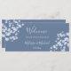 Gráfico de recepção de boas-vindas com cereja azul branca floresce num fundo azul empoeirado. Um texto de boas-vindas e seus nomes de noiva e noiva em uma elegante fonte escrita à mão.