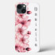 O nome personalizado cereja moderna floresce rosa na capas de iphone branca de fundo, um acessório chic e elegante inspirado pela beleza do Japão. Esta capa de telefone floral moderna é o presente perfeito ou presente de aniversário para ela, ou como um item especial para você mesmo.