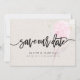 Este design apresenta uma flor em aquarela rosa suave por trás das palavras "save the date" em negrito e letra manuscrita preta contra um fundo de papel falso. Os nomes do casal e os detalhes do casamento são exibidos abaixo e podem ser personalizados. Gráficos ©Create The Cut