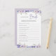 "Flower All Eyes On The Bride Chá de panela Game" é uma atividade encantadora e criativa para chás de panela. Este jogo apresenta belos designs de flores roxas que inspiram os hóspedes a esboçar seus vestidos de casamento dos sonhos. Com seu charmoso tema floral, esse jogo adiciona um toque de elegância à celebração. Deixem seus hóspedes mostrar seu talento artístico e imaginação com este divertido e engajador jogo de chá de panela!