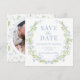 Chic e sofisticado, este convite para fotos "Salve a data" para um casamento boho mostra um tema botânico rústico elegante com flores de primavera azul-claro.