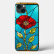 Um sofisticado trabalho de arte de vidro colorido com uma flor vermelha vibrante com folhas verdes sobre um fundo azul brilhante, enfeitado com intrincados elementos florais e detalhes elegantes que exaltam a arte e a elegância.