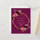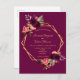 Na frente: Um convite de casamento moderno e moderno. Um fundo burguês escuro com uma falsa estrutura geométrica dourada. Decorados com flores, rosas e penas do estilo "boho" escuras e burguesas. Modelos para seus nomes e detalhes do casamento. Os nomes são escritos com um script de estilo manuscrito, letras ouros coloridas. Fundo branco.