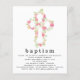Um valor para o alternativo do ORÇAMENTO em tamanho menor de 4,5 x 5,6" de semirbrilho de 110 lbs, que é de espessura semelhante a um cartão postal (no entanto, não é adequado para uso como cartão postal). POR FAVOR, OBSERVE QUE HÁ UM convite por folha. Florais Rosa Cruzam Convite Batismo. Uma grande cruz com flores cor-de-rosa está na metade superior. O cabeçalho é grande em na moda lowercase com os detalhes abaixo. Personalize facilmente o texto para seus próprios detalhes.