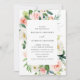 Convite para casamento floral Elegante de primavera com seus nomes e detalhes de casamento emoldurados por flores brancas e esbranquiçadas de aquarela e folhas verdes esmagadas. Uma escolha moderna que é perfeita para casamentos de primavera e verão.