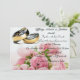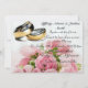 Convite elegante e elegante do casamento. As alianças de casamento e um buquê cor-de-rosa cor-de-rosa, adicionam um toque da sofisticação e dão-no que de gama alta olhe, de uns convites muito mais caros. Na parte de trás do convite é um buquê, com rosas brancos, bolotas e alianças de casamento. Este é verdadeiramente um convite original. Naturalmente você personalizá-lo-á com seu próprio texto. Você pode igualmente mudar a qualidade do papel.