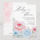 Um Sexo De Bebê Floral Revela convite de festas. Num fundo branco, apresentam-se elegantes flores azuis e cor-de-água, cor-de-rosa, e folhagem verde de eucalipto, incluindo um bebê fofo dormindo dentro de pétalas de flores. O texto elegante da tipografia negra lê Baby in bloom.