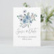 Um bonito buquê de aquarela de flores azuis com escrita e tipografia simples para o anúncio perfeito do casamento Save the Date.