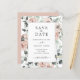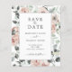 Elegante casamento floral Salve a data com um quadro composto por rosas pintados de cor d'água em cor rosa rosa poeirento e verde em tons de verde sábio. Este adorável tema botânico sem foto Salve a data é parte de uma coleção que é excelente para um casamento de primavera ou verão.