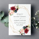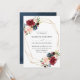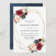 O convite para casamento floral elegante mostra seus detalhes de casamento cercados por uma falso estrutura de folha de ouro com buquês de flores rosas, cor-de-rosa-pincel e marinho azul-aquarela e folhagem verde-escura. O verso do convite apresenta um fundo de cor azul-d-água opcional marinho.