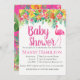 Arranjo floral tropical aquoso e flamingo com retorno floral correspondente, convite para chá de fraldas. Personalize o estilo, a cor e o tamanho da fonte do texto.