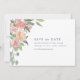 Nosso Planador de Meio-Verão salve o cartão de data com seus principais detalhes de casamento (nomes, data de casamento, local e site) acentuados por flores de aquarela pastel e folhagem em tons suaves de rosa-pincel, pêssego, marfim e verde-salva. Um moderno e elegante salvando a design de data que é um minimalista chic pegando a tendência floral da aquarela.