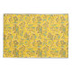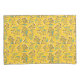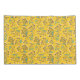 Seamless floral pattern with delicate branches, blue-green leaves, and pink buds on a vibrant yellow background, creating a cheerful, lively tone.
