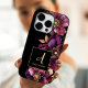 Ouro Roxo Elegante Capa de telefone Negra Floral Monograma. 3 flores florescentes em detalhes vermelhos profundos, roxos e ouros e folhas são agrupadas num arco mole no lado direito desta capa de telefone. Um quadro preto e ouro com a letra do seu monograma e o nome do cheio personalizável para você é colocado no centro na parte inferior da superfície. Esse caso está disponível para muitos tamanhos e modelos. Localize em "Tipo de dispositivo". Veja também produtos correspondentes com o mesmo tema design, como cartão de visita e planejador.