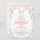 Floral Rosa Algumas Miúdas Coelhinhas Aniversário Convidam Um belo convite de aniversário, com um coelho ou coelho branco, alguns arranjos florais cor-de-rosa, faixa cor-de-rosa e textura azul-dourada. Esta design é uma maneira doce de convidar convidados para uma festa de aniversário temática de coelhinho para uma garotinha.