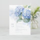 Moderno e elegante. Este maravilhoso cartão de convite de casamento plano de solteiro apresenta um buquê floral de híbridos azuis frescos no cheio florado, contra sotaques de aquarela azul. Um conjunto de fontes contemporâneas cria um novo tom moderno.