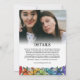 Dois lados em um convite de casamento fotográfico para um casamento de gay ou lésbica com uma foto do casal feliz de um lado sob uma formulação informal de convite para o casamento com seus nomes em letras grandes sob flores coloridas arco-íris e o hálito do bebê. Do outro lado, adicione uma segunda foto junto com seus detalhes de casamento, como acomodação, site, registro e qualquer outra coisa que você precisar. Um convite de casamento LGBT floral de dupla face em cores de orgulho personalizadas com fotos.