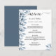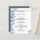 Um cartão de casamento elegante e moderno. Flores botânicas, folhas e pererecas, de cor aquosa azul. Personalize e adicione seus nomes, data e menu de casamento. Um fundo branco chic. Letras pretas coloridas. A palavra Menu é escrita com um script de estilo de letras modernas com alternâncias. Fundo: cinza azul.