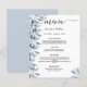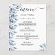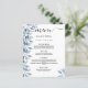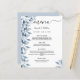 Um cartão de casamento elegante e moderno. Flores botânicas, folhas e pererecas, de cor aquosa azul. Personalize e adicione seus nomes, data e menu de casamento. Um fundo branco chic. Letras pretas coloridas. A palavra Menu é escrita com um script de estilo de letras modernas com alternâncias. Fundo: uma cinza azul clara.
