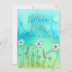 Um 75º convite de aniversário decorado com delicadas flores brancas silvestres desenhadas em caneta e tinta num fundo azul, verde e amarelo de lavagem com aquarela. Você pode editar o texto para ajustado das suas necessidades.