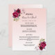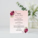 Um cartão de casamento elegante, moderno e romântico. Rosa dourado, fundo cor-de-rosa pincelado, decorado com flores impermeáveis em burgundy e rosa dourado. Modelos para seus nomes, data e menu de casamento. Letras pretas coloridas. Fundo: Rosa de gradiente ouro.