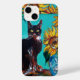 Gato preto expressivo e branco, girassóis coloridos e folhas verdes em cores azul-amarelo e azul-turquesa. Pintura acrílica original, artística e vibrante, de Búlgaro Lumini (c)