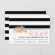 Este maravilhoso cartão de resposta RSVP de casamento floral apresenta flores bonito, cor-de-rosa e amarelas, com folhagem verde e um padrão listrado preto e branco. Seu texto está em uma banda branca com uma faixa de ouro.