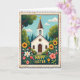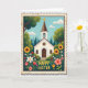 Este cartão mostra uma pequena capela rural centrada numa paisagem verde exuberante, emoldurada por uma borda perfurada que se assemelha a um selo postal antigo. O edifício de cor creme tem uma torre alta coroada por uma pequena cruz dourada, janelas arqueadas e uma porta de madeira que parece pronta para acolher dois amigos chegando lado a lado. Ao redor, girassóis com centros escuros se misturam com flores brancas e vermelhas brilhantes, escondidos entre arbustos frondosos e árvores altas, com alguns toques de 🌷 que adicionam um clima suave e afetuoso. Acima, um céu azul claro contém algumas nuvens suaves, como um pano de fundo calmo para um momento compartilhado de primavera. Ao longo da parte inferior, uma saudação sazonal está escrita em letras grandes e amarelas quentes, centrada abaixo da cena. Os verdes, azuis e cores das flores são ricos e ensolarados, e os detalhes cuidadosos das pétalas e folhas fazem o jardim parecer cheio e convidativo. A moldura perfurada é