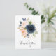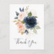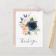 Este obrigado branco de flores e marinhos que você faz é perfeito para um casamento floral. O clássico e elegante design apresenta marinho de aquarela azul e flores cor-de-rosa pinceladas. Personalize a parte traseira do cartão postal com seus nomes, seu endereço de devolução e uma mensagem de obrigado. Como alternativa, deixe o vazio da seção modelo para enviar uma nota personalizada e ponderada em cada cartão após a sua chegada. Essas cartas podem ser usadas para um casamento, chá de panela ou qualquer evento especial.
