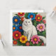 Gato branco fofo sentado num pedaço de flores coloridas de arte popular. Cartão de saudação temido para gatos bonitos para amantes de gatos.